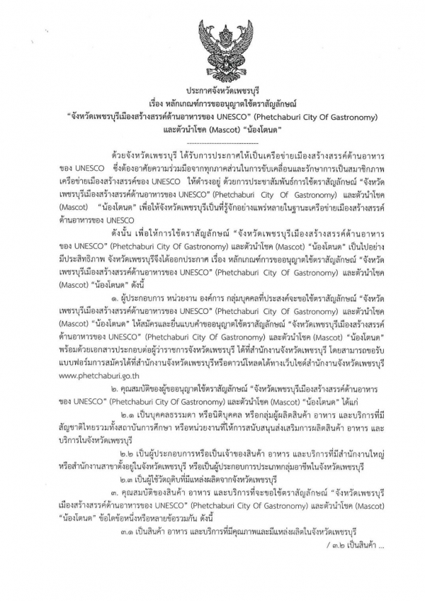 หลักเกณฑ์การขออนุญาตใช้ตาสัญลักษณ์จังหวัดเพชรบุรีเหมืองสร้างสรรค์ด้านอาหารของ UNESCO(Phetcburi City of Gastronomy)และตัวนำโชค (Mascot) "น้องโตนด"