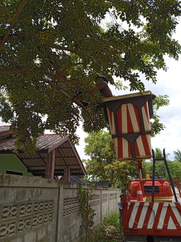 มอบหมายให้เจ้าที่กองช่าง ลงพื้นที่ในการดำเนินงาน นำรถเครื่องจักรกลขนาดเบา (รถกระเช้า) พร้อมอุปกรณ์ซ่อมแซมไฟฟ้าและตัดต้นไม้สาธารณะ