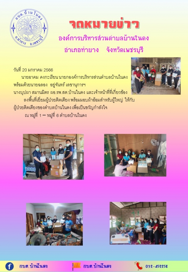 วันที่ 20 มกราคม 2566ลงพื้นที่เยี่ยมผู้ป่วยติดเตียง พร้อมมอบผ้าอ้อมสำหรับผู้ใหญ่ ให้กับผู้ป่วยติดเตียงของตำบลบ้านในดง เพื่อเป็นขวัญกำลังใจ