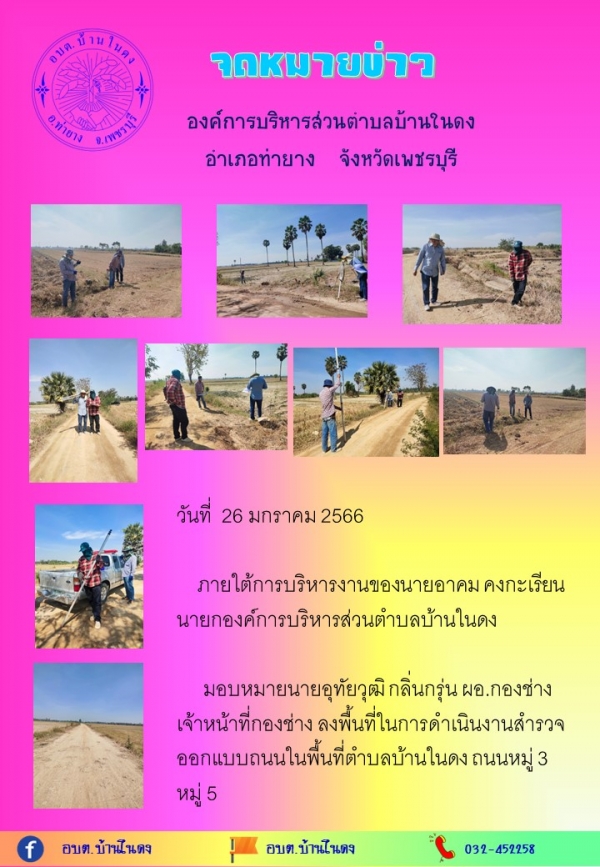 มอบหมายนายอุทัยวุฒิ กลิ่นกรุ่น ผอ.กองช่าง เจ้าหน้าที่กองช่าง ลงพื้นที่ในการดำเนินงานสำรวจออกแบบถนนในพื้นที่ตำบลบ้านในดง ถนนหมู่ 3 หมู่ 5