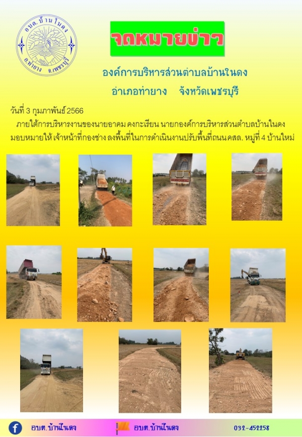 ภายใต้การบริหารงานของนายอาคม คงกะเรียน นายกองค์การบริหารส่วนตำบลบ้านในดง มอบหมายให้ เจ้าหน้าที่กองช่าง ลงพื้นที่ในการดำเนินงานปรับพื้นที่ถนน คสล. หมู่ที่ 4 บ้านใหม่ ที่ได้ออกประชุมประชาคมรับฟังความคิดเห็นของประชาชน