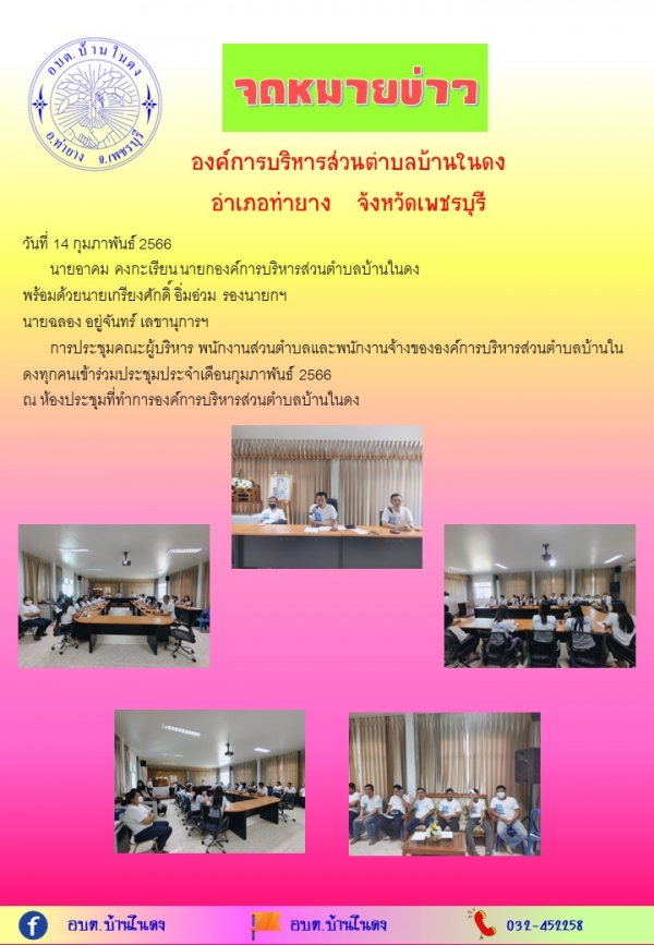 การประชุมคณะผู้บริหาร พนักงานส่วนตำบลและพนักงานจ้างขององค์การบริหารส่วนตำบลบ้านในดงทุกคนเข้าร่วมประชุมประจำเดือนกุมภาพันธ์ 2566