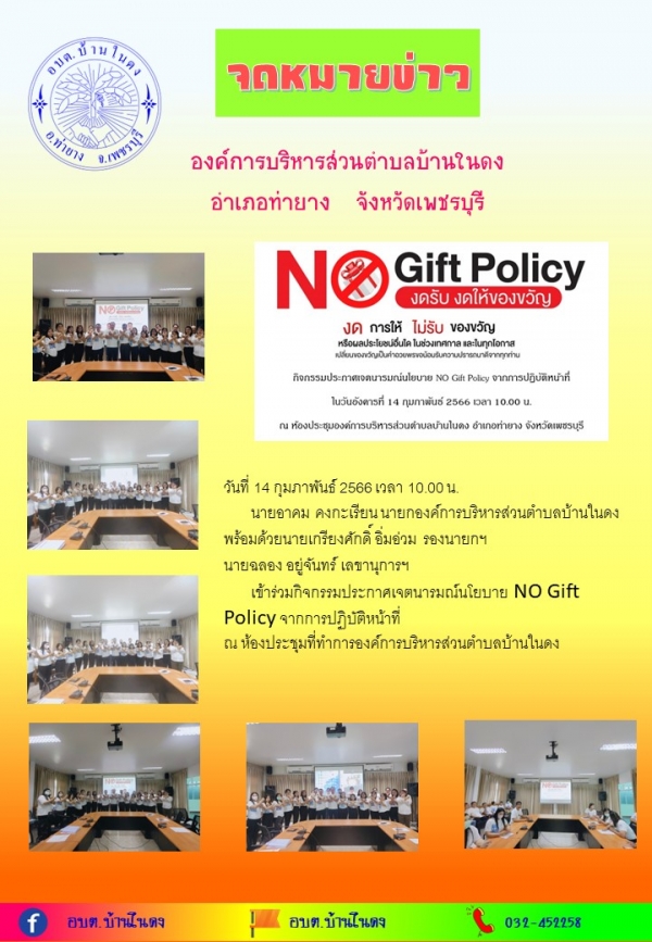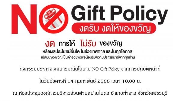 วันที่ 14 กุมภาพันธ์ 2566 เข้าร่วมกิจกรรมประกาศเจตนารมณ์นโยบาย NO Gift Policy จากการปฏิบัติหน้าที่