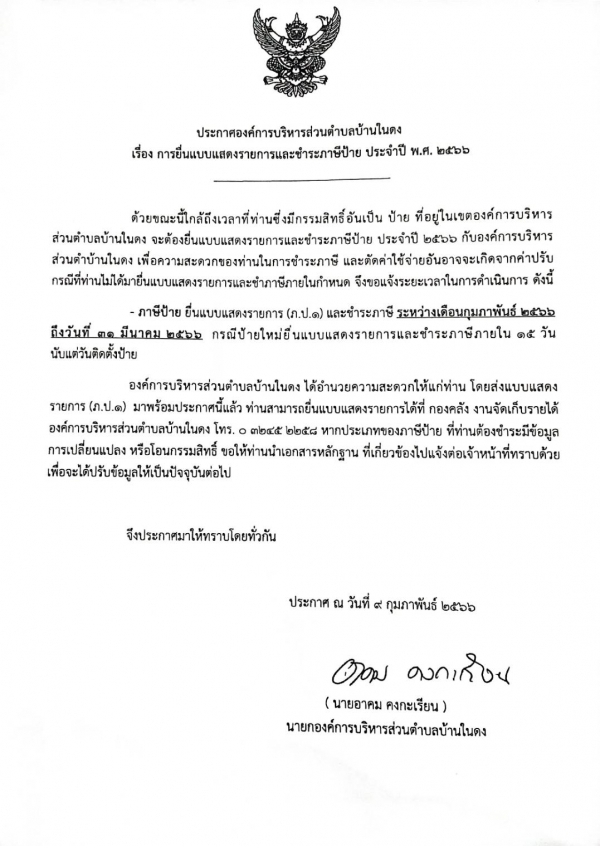เรื่องการยื่นแบบแสดงรายการและชำระภาษีป้ายประจำปี พ.ศ. 2566