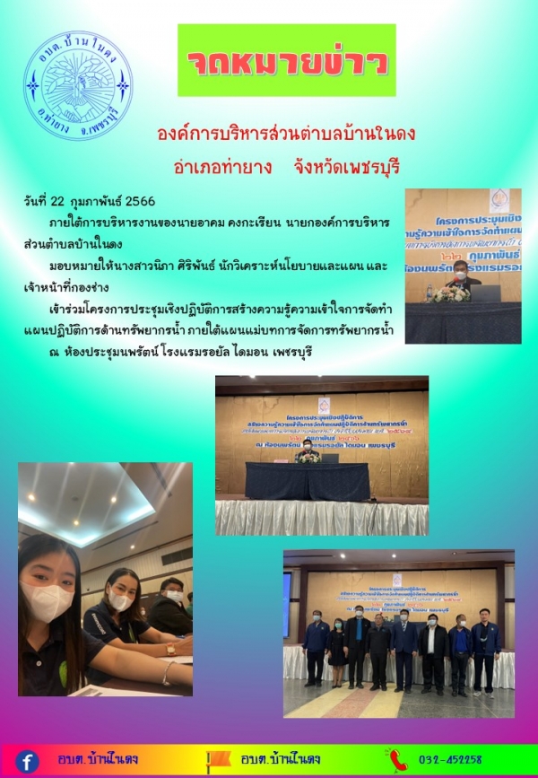 วันที่ 22 กุมภาพันธ์ 2566เข้าร่วมโครงการประชุมเชิงปฏิบัติการสร้างความรู้ความเข้าใจการจัดทำแผนปฏิบัติการด้านทรัพยากรน้ำ ภายใต้แผนแม่บทการจัดการทรัพยากรน้ำ