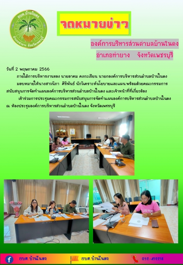 มอบหมายให้นางสาวนิภา ศิริพันธ์ นักวิเคราะห์นโยบายและแผน พร้อมด้วยคณะกรรมการสนับสนุนการจัดทำแผนองค์การบริหารส่วนตำบลบ้านในดง และเจ้าหน้าที่ที่เกี่ยวข้อง