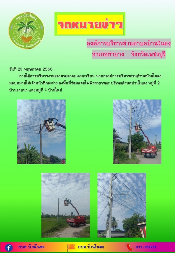 ภายใต้การบริหารงานของนายอาคม คงกะเรียน นายกองค์การบริหารส่วนตำบลบ้านในดง มอบหมายให้เจ้าหน้าที่กองช่าง ลงพื้นที่ซ่อมแซมไฟฟ้าสาธารณะบริเวณตำบลบ้านในดง หมู่ที่ 2 บ้านชายนา และหมู่ที่ 4 บ้านใหม่
