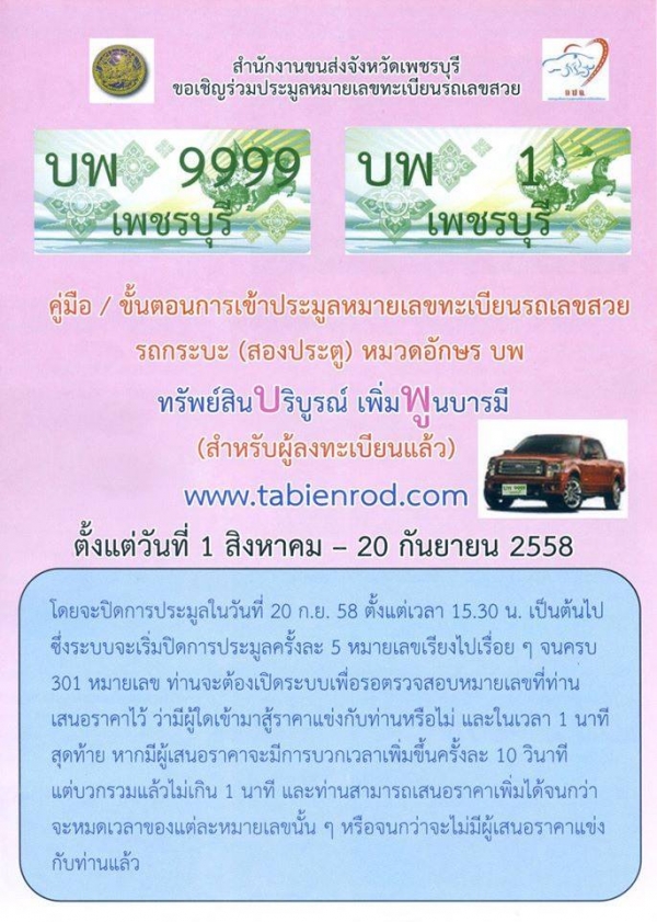 ขอเชิญประมูลหมายเลขทะเบียนรถเลขสวย รถกระบะ(สองประตู) ครั้งแรก ของจังหวัดเพชรบุรี หมวดอักษร "บพ"