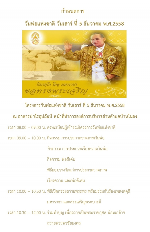 ขอเชิญชวนประชาชนตำบลบ้านในดง เข้าร่วมโครงการวันพ่อแห่งชาติ ประจำปีงบประมาณ 2559 เพื่อเฉลิมฉลองในโอกาสวันเฉลิมพระชนมพรรษาของพระบาทสมเด็จพระเจ้าอยู่หัว และร่วมเทิดพระเกียรติ ร่วมแสดงความจงรักภักดี และร่วมสำนึกในพระมหากรุณาธิคุณของพระบาทสมเด็จพระเจ้าอยู่หัว ในวันเสาร์ที่ ๕ เดือนธันวาคม พ.ศ. 2558 ณ อาคารปวโรอุปถัมป์ หน้าที่ทำการองค์การบริหารส่วนตำบลบ้านในดง อำเภอท่ายาง จังหวัดเพชรบุรี