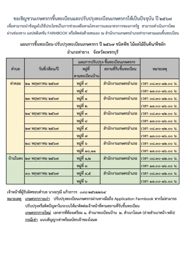 เรื่อง ขอเชิญชวนเกษตรกรขึ้นทะเบียนและปรับปรุงทะเบียนเกษตรกรให้เป็นปัจจุบัน ปี 2567 สามารถดำเนินการผ่านช่องทางแอปพลิเคชัน FARMBOOK หรือติดต่อด้วยตนเอง ณ สำนักงานเกษตรอำเภอท่ายาง