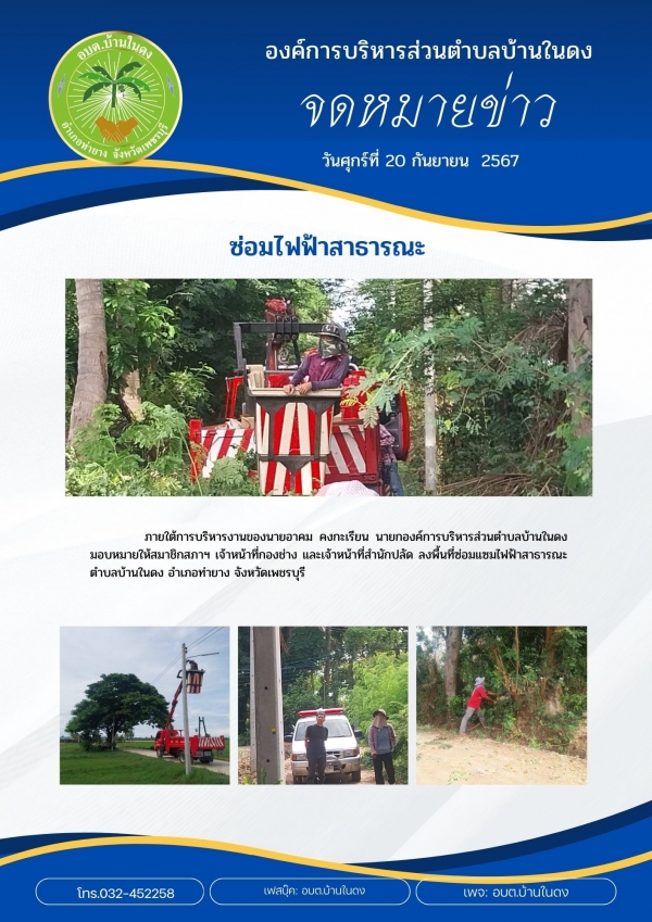 มอบหมายให้สมาชิกสภาฯ เจ้าหน้าที่กองช่าง และเจ้าหน้าที่สำนักปลัด ลงพื้นที่ซ่อมแซมไฟฟ้าสาธารณะ ตำบลบ้านในดง อำเภอท่ายาง จังหวัดเพชรบุรี