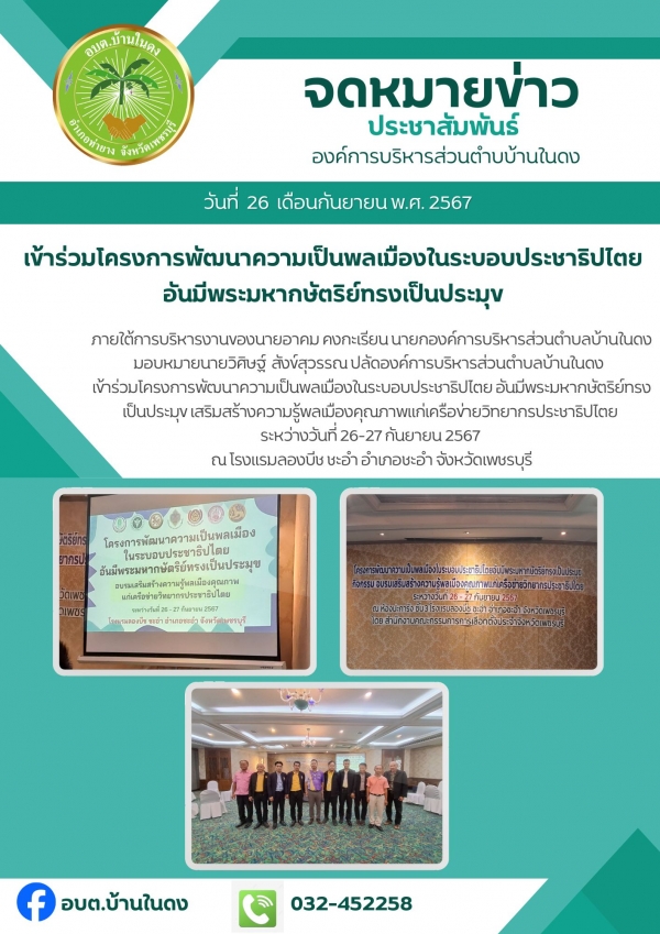 วันพฤหัสบดีที่ 26 กันยายน 2567 เข้าร่วมโครงการพัฒนาความเป็นพลเมืองในระบอบประชาธิปไตย อันมีพระมหากษัตริย์ทรงเป็นประมุข เสริมสร้างความรู้พลเมืองคุณภาพแก่เครือข่ายวิทยากรประชาธิปไตย