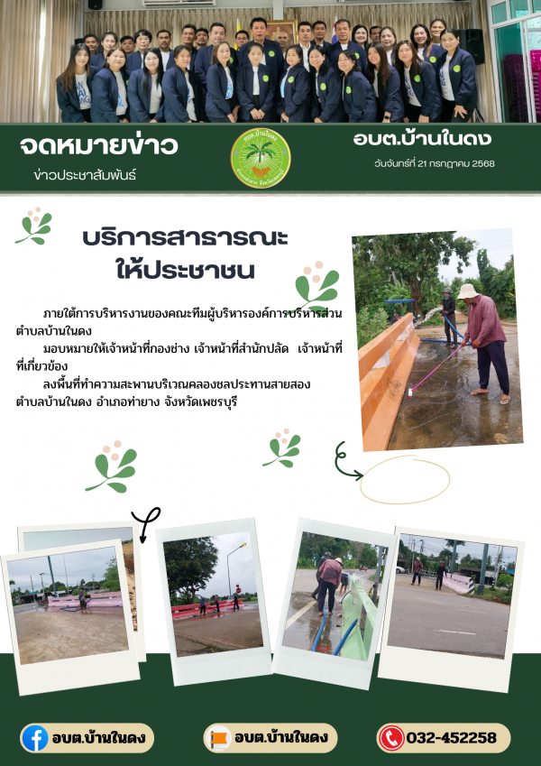 มอบหมายให้เจ้าหน้าที่กองช่าง ลงพื้นที่ในการดำเนินงานรางวัดที่ดินสาธารณประโยชน์ เพื่อให้ทราบแนวเขตที่ดินสาธารณะประโยชน์ชัดเจนโดยมีเจ้าหน้าที่สำนักงานที่ดินจังหวัดเพชรบุรี สาขาท่ายาง เป็นผู้ดำเนินการในครั้งนี้พื้นที่ตำบลบ้านในดง