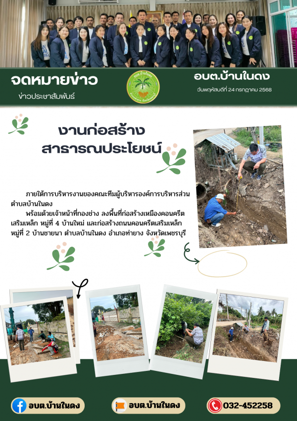 พร้อมด้วยเจ้าหน้าที่กองช่าง ลงพื้นที่ก่อสร้างเหมืองคอนครีตเสริมเหล็ก หมู่ที่ 4 บ้านใหม่ และก่อสร้างถนนคอนครีตเสริมเหล็ก หมู่ที่ 2 บ้านชายนา ตำบลบ้านในดง อำเภอท่ายาง จังหวัดเพชรบุรี