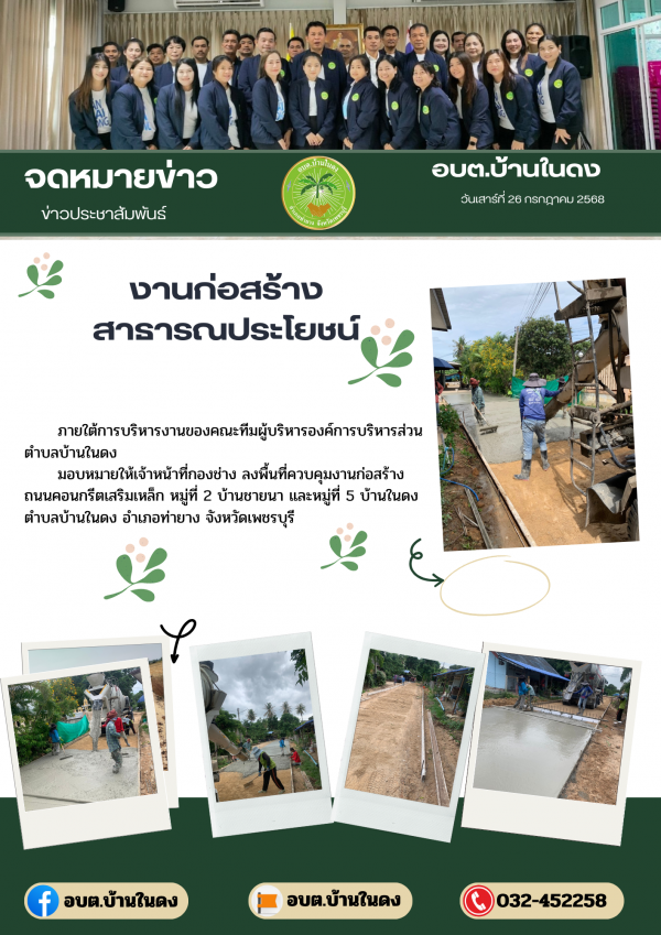 มอบหมายให้เจ้าหน้าที่กองช่าง ลงพื้นที่ควบคุมงานก่อสร้างถนนคอนกรีตเสริมเหล็ก หมู่ที่ 2 บ้านชายนา และหมู่ที่ 5 บ้านในดง ตำบลบ้านในดง อำเภอท่ายาง จังหวัดเพชรบุรี