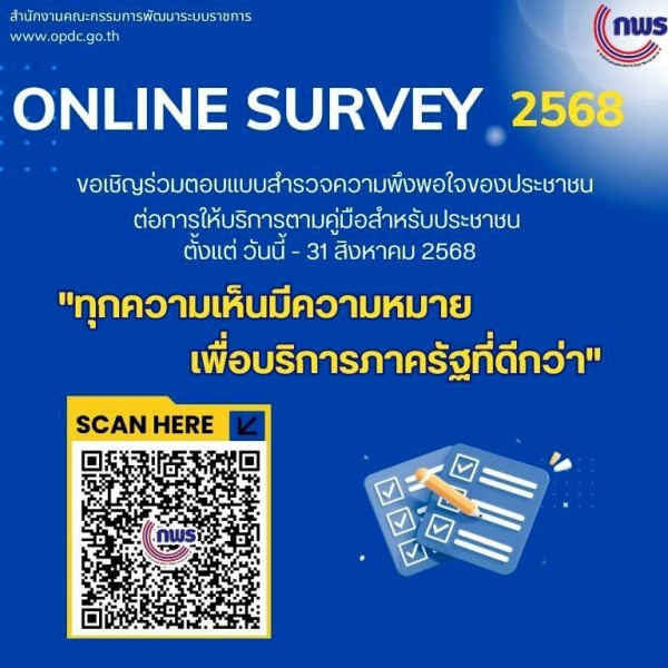 สำนักงาน ก.พ.ร. ขอเชิญร่วมตอบแบบสำรวจความพึงพอใจของประชาชนต่อการให้บริการของหน่วยงานของรัฐ ปี พ.ศ. 2568 เพื่อประโยชน์ในการพัฒนาบริการภาครัฐและอำนวยความสะดวกแก่ประชาชนโดยสามารถแสดงความเห็นได้ตั้งแต่บัดนี้จนถึงวันที่ 31 สิงหาคม 2568 ได้ที่ลิงก์