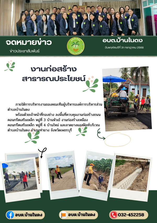 พร้อมด้วยเจ้าหน้าที่กองช่าง ลงพื้นที่ควบคุมงานก่อสร้างถนนคอนกรีตเสริมเหล็ก หมู่ที่ 3 บ้านหัวเข้ ก่อสร้างเหมืองคอนกรีตเสริมเหล็ก หมู่ที่ 4 บ้านใหม่ และลาดยางแอสฟัลท์บริเวณ ตำบลบ้านในดง อำเภอท่ายาง จังหวัดเพชรบุรี