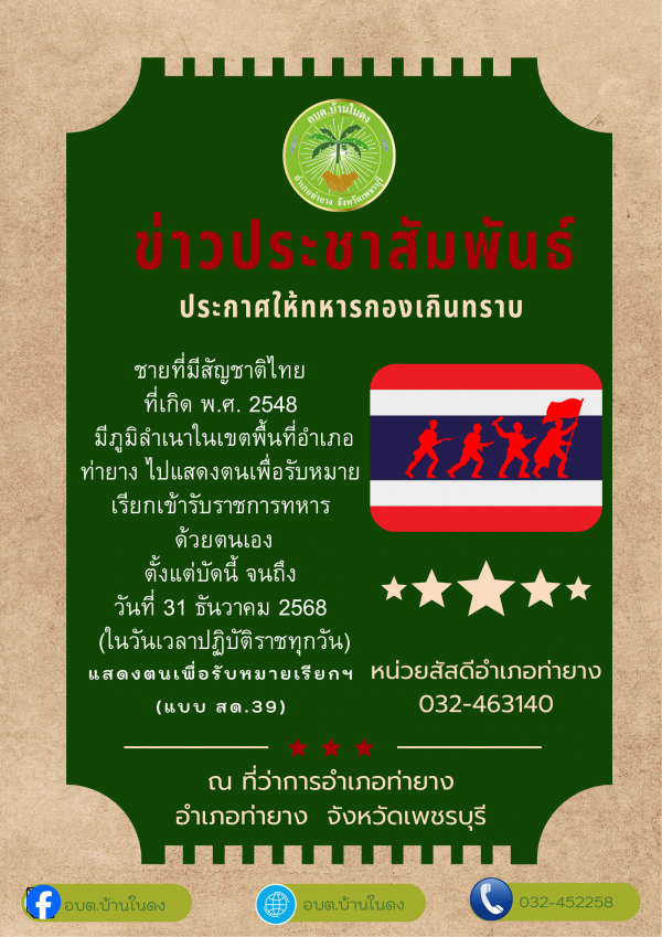 ชายที่มีสัญชาติไทยที่เกิด พ.ศ. 2548 มีภูมิลำเนาในเขตพื้นที่อำเภอท่ายาง ไปแสดงตนเพื่อรับหมายเรียกเข้ารับราชการทหาร