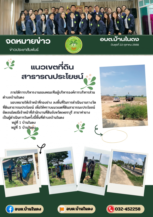 มอบหมายให้เจ้าหน้าที่กองช่าง ลงพื้นที่ในการดำเนินงานรางวัดที่ดินสาธารณประโยชน์ เพื่อให้ทราบแนวเขตที่ดินสาธารณะประโยชน์ชัดเจนโดยมีเจ้าหน้าที่สำนักงานที่ดินจังหวัดเพชรบุรี สาขาท่ายาง เป็นผู้ดำเนินการในครั้งนี้พื้นที่ตำบลบ้านในดง