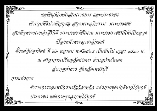 ขอเชิญชวนหัวหน้าส่วนราชการและประชาชนเข้าร่วมพิธีบำเพ็ญกุศลสวดพระอภิธรรมพระบรมศพ สมเด็จพระนางเจ้าสิริกิติ์ พระบรมราชินีนาถ พระบรมราชชนนีพันปีหลวง เบื้องหน้าพระฉายาลักษณ์