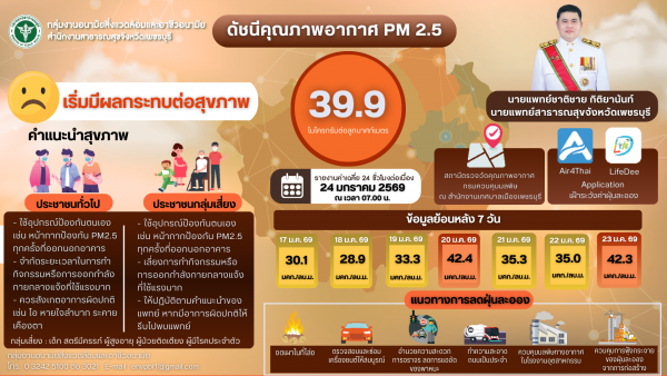 ประกาศแจ้งเตือนคุณภาพอากาศ PM 2.5 จังหวัดเพชรบุรี ประจำวันเสาร์ที่ 24 มกราคม 2569