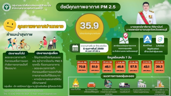 ประกาศแจ้งเตือนคุณภาพอากาศ PM2.5 จังหวัดเพชรบุรี ประจำวันพฤหัสบดีที่ 5 กุมภาพันธ์ 2569