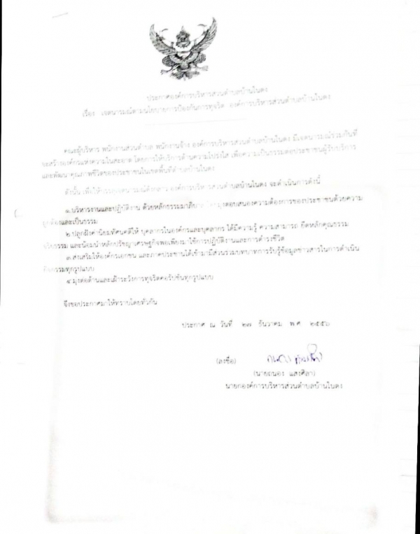 ประกาศ เจตจำนงค์ตามนโยบายการป้องกันการทุจริต องค์การบริหารส่วนตำบลบ้านในดง
