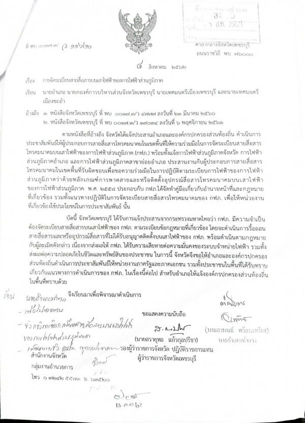 ข่าวฝากประชาสัมพันธ์จาก กฟภ. ได้แจ้งแนวทางปฏิบัติในการจัดระเบียบสายหรืออุปกรณ์สื่อสารโทรคมนาคม บนเสาไฟฟ้าฯ ให้ผู้ประกอบการ ให้ความร่วมมือในการจัดระเบียบสายสื่อสารโทรคมนาคมบนเสาไฟฟ้าของ กฟภ.นั้น ทางจังหวัดได้รับแจ้งจากกระทรวงมหาดไทย ว่า กฟภ. มีความจำเป็นต้องจัดระเบียบสายสื่อสารบนเสาไฟฟ้าของ กฟภ. ตามระเบียบกฎหมายที่เกี่ยวข้อง โดยจะดำเนินการรื้อถอนสายสื่อสารและอุปกรณ์สื่อสารที่ไม่ได้รับอนุญาตติดตั้งบนเสาไฟฟ้าของ กฟภ. พร้อมทั้งดำเนินการตามกฎหมายกับผู้กระทำความผิดละเมิดดังกล่าว เนื่องจากส่งผลให้ กฟภ. ได้รับความเสียหายต่อความมั่นคงของระบบจำหน่ายไฟฟ้า รวมทั้งส่งผลกระทบต่อความปลอดภัยในชีวิตและทรัพย์สินของประชาชน จึงขอประชาสัมพันธ์ให้หน่วยงานภาครัฐ ภาคเอกชน และประชาชนได้รับทราบเกี่ยวกับแนวทางในการดำเนินการเรื่องนี้ของ กฟภ. ต่อไป