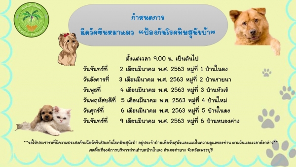 **ขอให้ประชาชนที่มีความประสงค์จะฉีดวัคซีนป้องกันโรคพิษสุนัขบ้า อยู่ประจำบ้านเพื่อจับสุนัขและแมวในความดูแลของท่าน ตามวันและเวลาดังกล่าว**