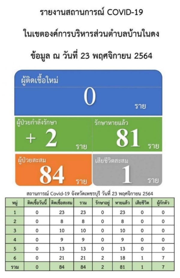 สถานการณ์โควิด-19 ตำบลบ้านในดง อำเภอท่ายาง จังหวัดเพชรบุรี ข้อมูล ณ วันที่ 23 พฤศจิกายน 2564