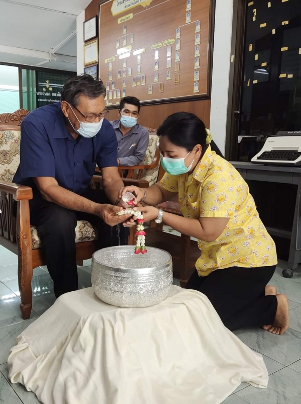 รดน้ำขอพรจาก นายถนอง แสงศิลา นายก อบต.บ้านในดง เนื่องในโอกาสวันสงกรานต์หรือปีใหม่ไทยที่กำลังจะมาถึง ปี พ.ศ.2564