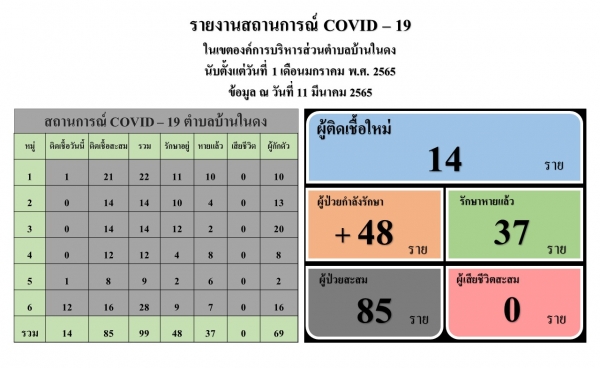 ข้อมูล ณ วันที่ 11 เดือนมีนาคม พ.ศ. 2565 พบผู้ติดเชื้อ 14 ราย