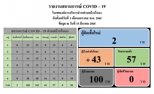 15 มีนาคม 2565 รายงานสถานการณ์โควิด-19 ตำบลบ้านในดง อำเภอท่ายาง จังหวัดเพชรบุรี