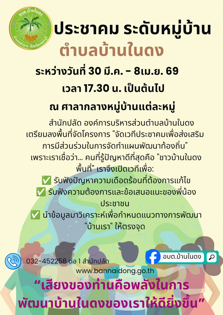 วันอังคารที่ 24 มีนาคม 2569ประชาสัมพันธ์: ขอเชิญร่วมเวทีประชาคมตำบลบ้านในดง