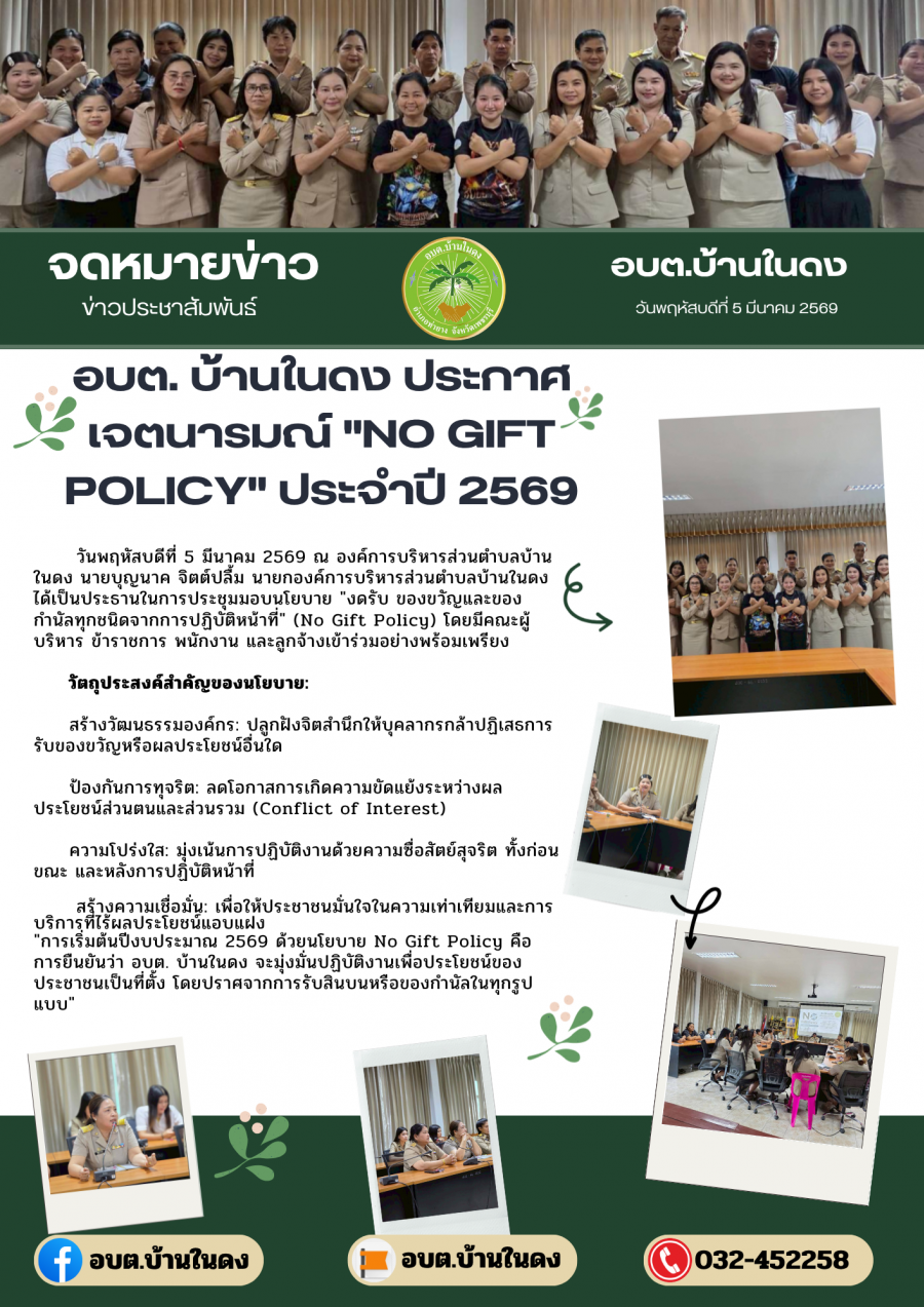 วันพฤหัสบดีที่ 5 มีนาคม 2569อบต. บ้านในดง ประกาศเจตนารมณ์ "No Gift Policy" ประจำปี 2569
