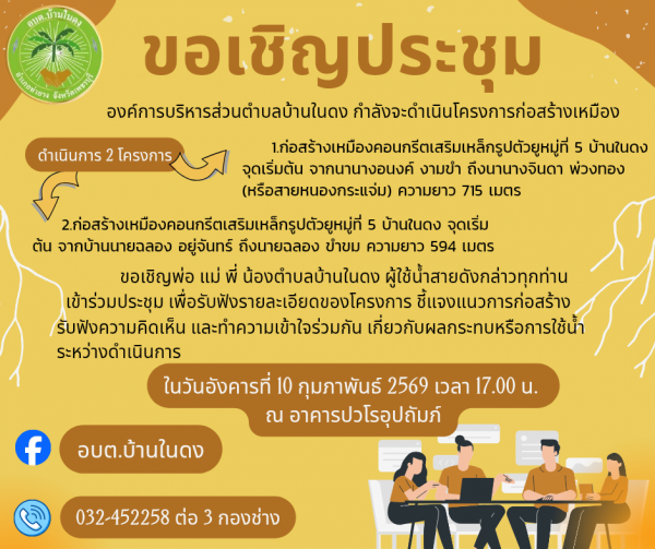 ขอเชิญพ่อ แม่ พี่ น้องตำบลบ้านในดง ผู้ใช้น้ำสายดังกล่าวทุกท่าน เข้าร่วมประชุมโครงการก่อสร้างเหมือง