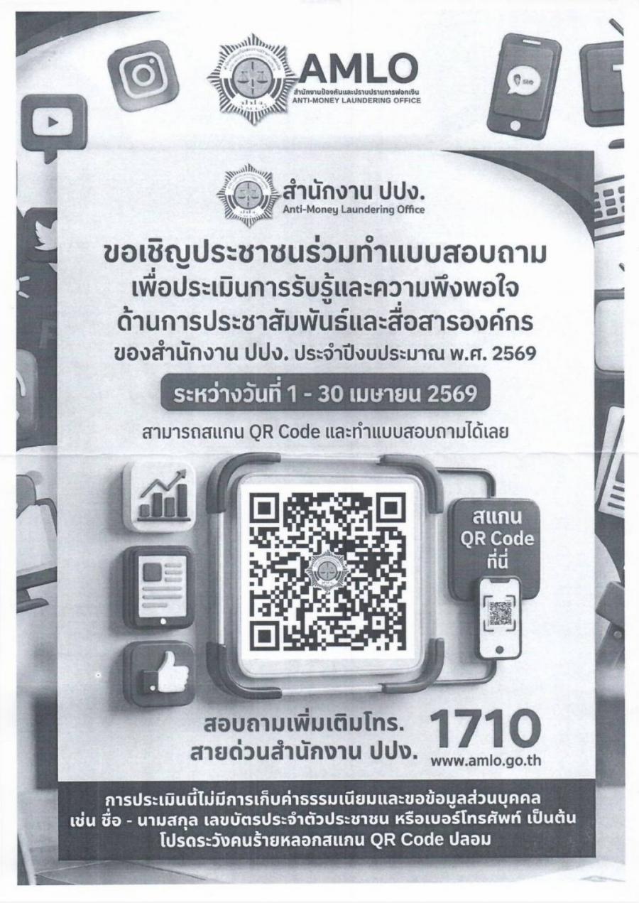 ขอเชิญประชาชนร่วมทำแบบสอบถาม เพื่อประเมิน การรับรู้และความพึงพอใจด้านการประชาสัมพันธ์และสื่อสารองค์กร ของสำนักงาน ปปง. ประจำปีงบประมาณ พ.ศ. 2569