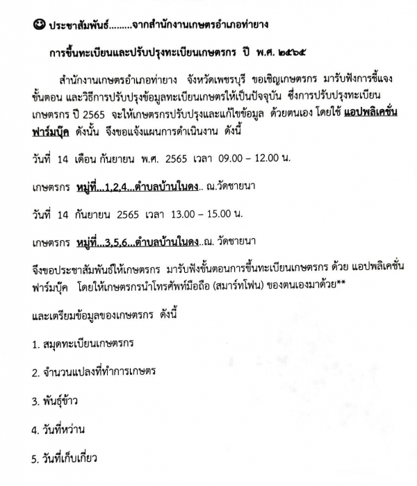 ขอเชิญเกษตรกรรับฟังการชี้แจงขั้นตอนและวิธีการปรับปรุงข้อมูลทะเบียนเกษตร ในวันพุธที่ 14 กันยายน 2565 ณ วัดชายนา