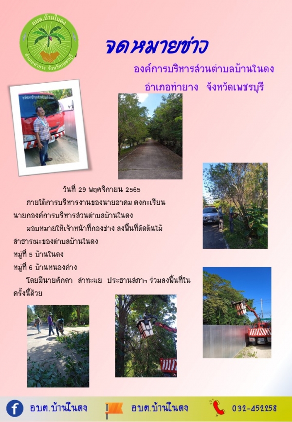 วันที่ 29 พฤศจิกายน 2565 ลงพื้นที่ในการดำเนินงาน นำรถเครื่องจักรกลขนาดเบา (รถกระเช้า) พร้อมอุปกรณ์ตัดต้นไม้สาธารณะ พื้นที่ตำบลบ้านในดง