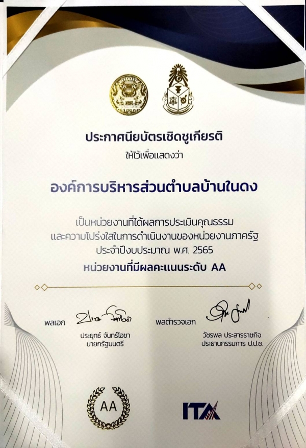 องค์การบริหารส่วนตำบลบ้านในดง ได้รับผลคะแนนการประเมินคุณธรรมและความโปร่งใสในการดำเนินงานของหน่วยงานภาครัฐ (Integrity and Transparency Assessment:ITA) ประจำปีงบประมาณ พ.ศ. 2565 ในระดับ AA