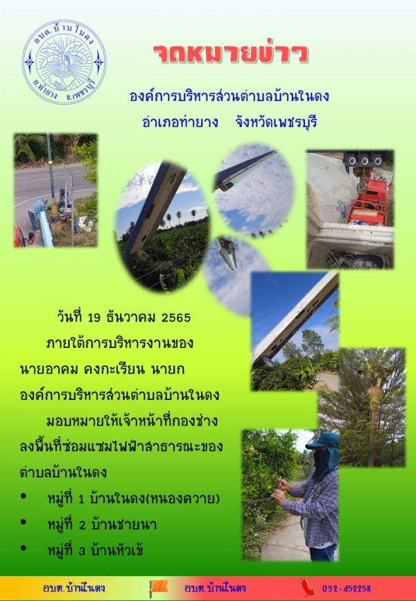 วันที่ 19 ธันวาคม 2565 ลงพื้นที่ในการดำเนินงาน นำรถเครื่องจักรกลขนาดเบา (รถกระเช้า) พร้อมอุปกรณ์ซ่อมแซมไฟฟ้าสาธารณะ