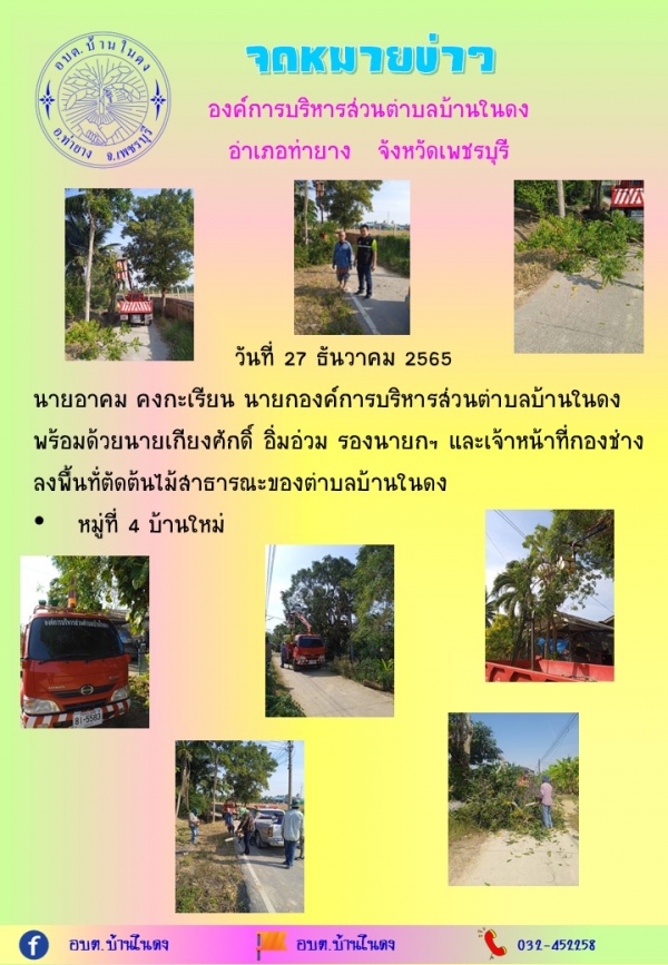 วันที่ 27 ธันวาคม 2565 ลงพื้นที่ในการดำเนินงาน นำรถเครื่องจักรกลขนาดเบา (รถกระเช้า) พร้อมอุปกรณ์ตัดต้นไม้สาธารณะ พื้นที่ตำบลบ้านในดง