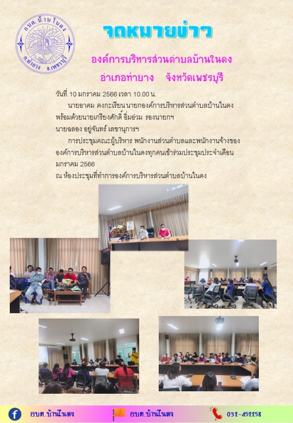 การประชุมคณะผู้บริหาร พนักงานส่วนตำบลและพนักงานจ้างขององค์การบริหารส่วนตำบลบ้านในดงทุกคนเข้าร่วมประชุมประจำเดือนมกราคม 2566