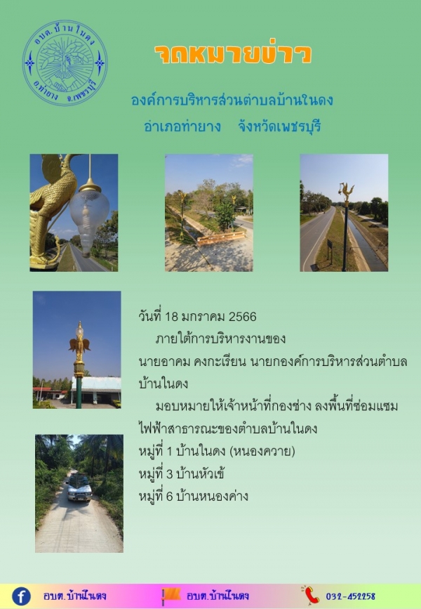 วันที่ 18 มกราคม 2566 ลงพื้นที่ในการดำเนินงาน นำรถเครื่องจักรกลขนาดเบา (รถกระเช้า) พร้อมอุปกรณ์ซ่อมแซมไฟฟ้าสาธารณะ