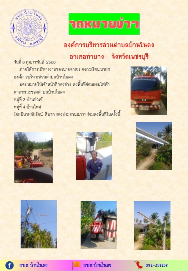 วันที่ 6 กุมภาพันธ์ 2566ลงพื้นที่ซ่อมแซมไฟฟ้าสาธารณะของตำบลบ้านในดง