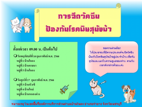 ให้ประชาชนที่มีความประสงค์จะฉีดวัคซีนป้องกันโรคพิษสุนัขบ้าอยู่ประจำบ้าน เพื่อจับสุนัขและแมวในความดูแลของท่าน ตามวันเวลาดังกล่าวด้วยนะค่ะ