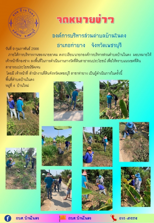 ภายใต้การบริหารงานของนายอาคม คงกะเรียน นายกองค์การบริหารส่วนตำบลบ้านในดง มอบหมายให้ เจ้าหน้าที่กองช่าง ลงพื้นที่ในการดำเนินงานรางวัดที่ดินสาธารณประโยชน์ เพื่อให้ทราบแนวเขตที่ดินสาธารณประโยชน์ชัดเจน