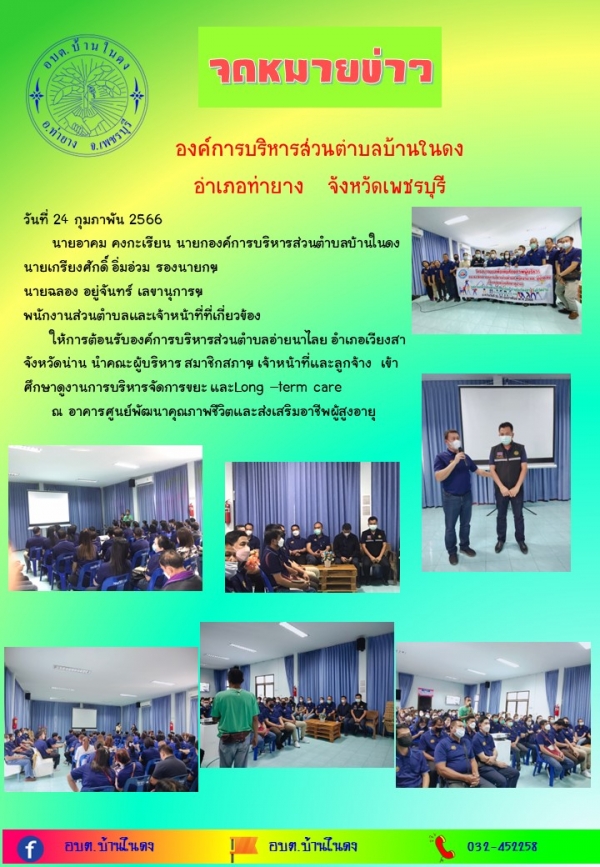 ให้การต้อนรับองค์การบริหารส่วนตำบลอ่ายนาไลย อำเภอเวียงสา จังหวัดน่าน นำคณะผู้บริหาร สมาชิกสภาฯ เจ้าหน้าที่และลูกจ้าง เข้าศึกษาดูงานการบริหารจัดการขยะ และLong –term care