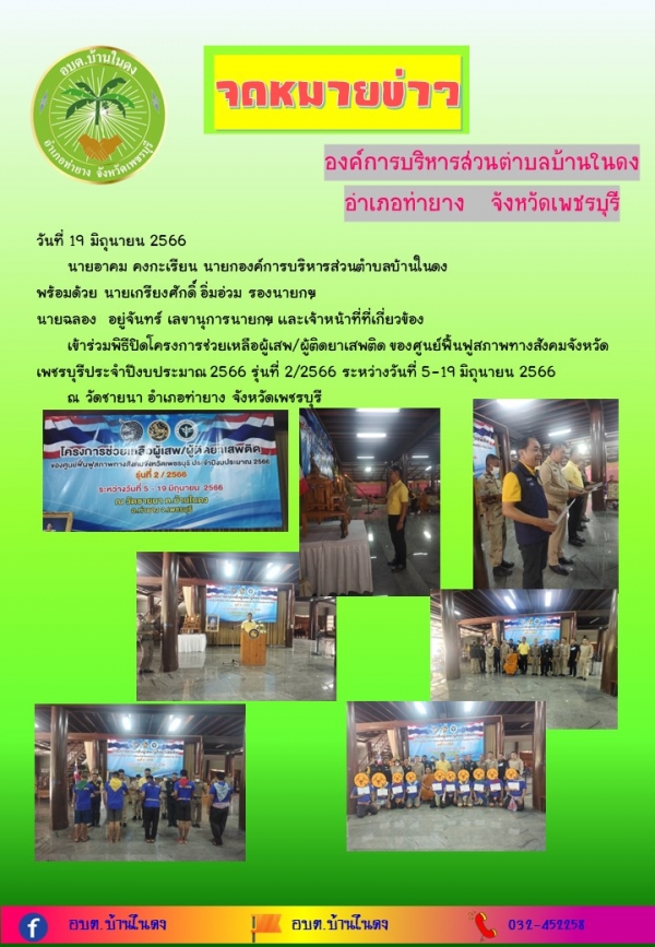 วันที่ 19 มิถุนายน 2566 เข้าร่วมพิธีปิดโครงการช่วยเหลือผู้เสพ/ผู้ติดยาเสพติด ของศูนย์ฟื้นฟูสภาพทางสังคมจังหวัดเพชรบุรี