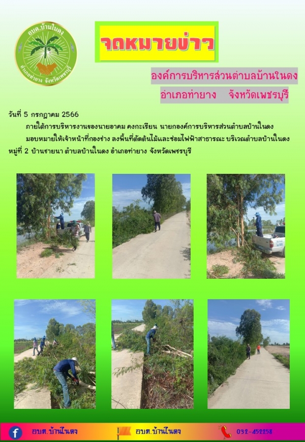 มอบหมายให้เจ้าหน้าที่กองช่าง ลงพื้นที่ตัดต้นไม้สาธารณะ บริเวณตำบลบ้านในดง หมู่ที่ 2 บ้านชายนา ตำบลบ้านในดง อำเภอท่ายาง จังหวัดเพชรบุรี